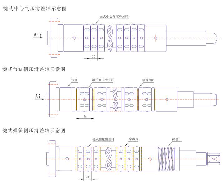 可組成中心氣壓式,氣動側(cè)壓式,機(jī)械側(cè)壓高性能滑差軸,中心氣壓摩擦轉(zhuǎn)動軸,可以獲得機(jī)械損失小,按空氣壓比例得出準(zhǔn)確轉(zhuǎn)矩,并能在大范圍內(nèi)精確地控制張力。應(yīng)用范圍最廣,鍵齒可以抓緊任何管芯。